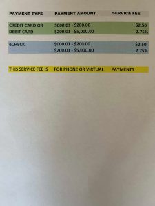 These are the service fee amounts for anyone paying their water bill with a credit card, debit card, and echeck. This fee will not be charged to any resident that has a monthly ACH draft set up and this fee is from the credit companies and not Diamond City, City Hall.